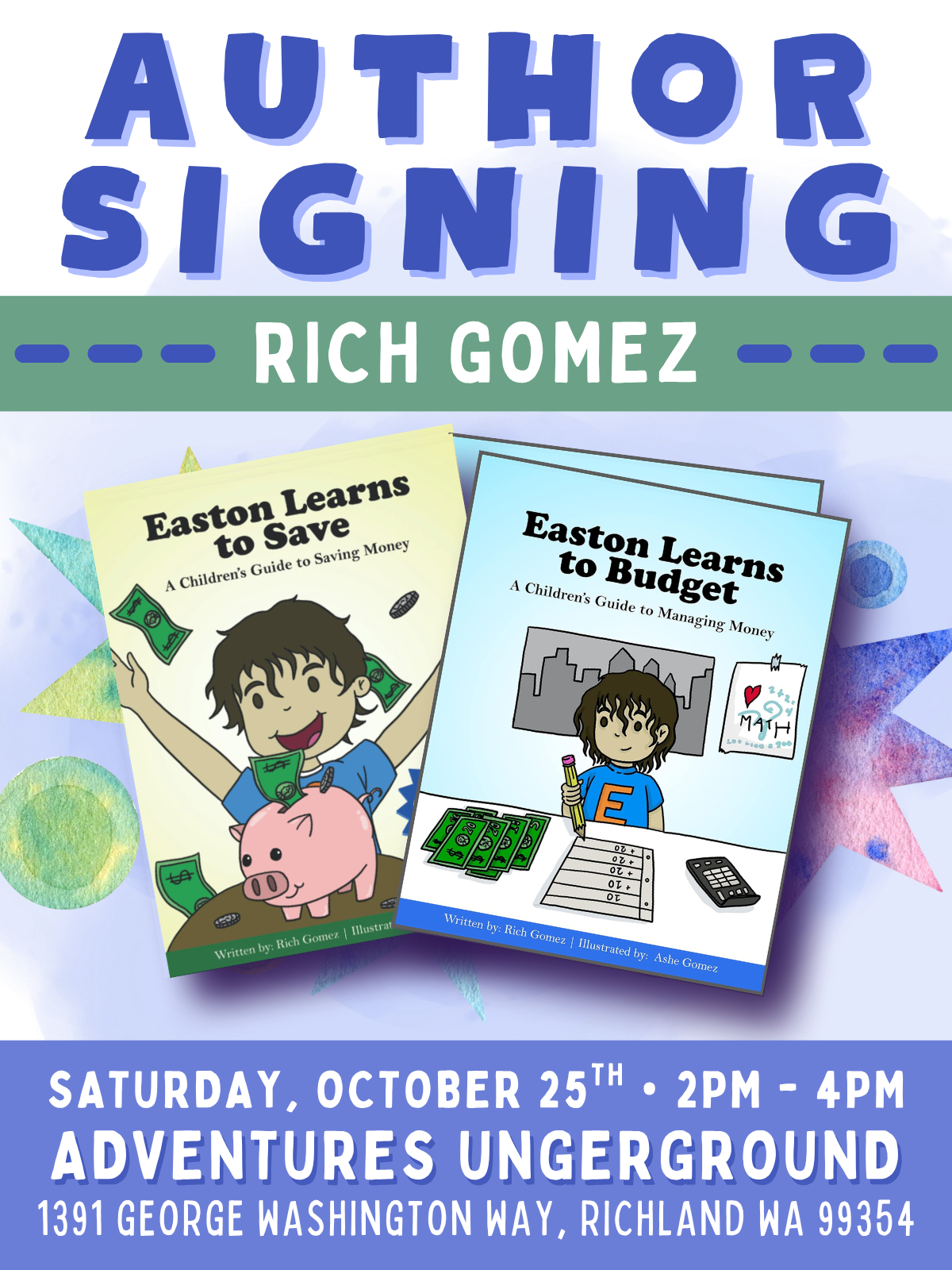 Local children's author Rich Gomez will be visiting on Saturday, October 25th from 2-4 PM to sign books and discuss money management!