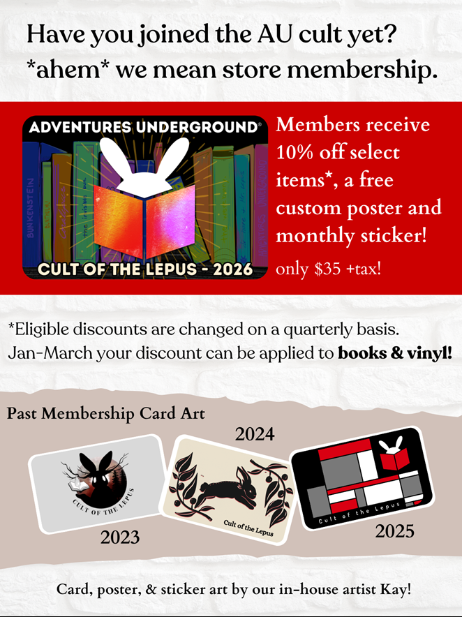But if your quest through our enormous selection of products comes up empty, we also offer gift cards, Adventures Underground branded swag, and all sorts of other AU goodies. We also offer subscriptions to your favorite types of goodies!