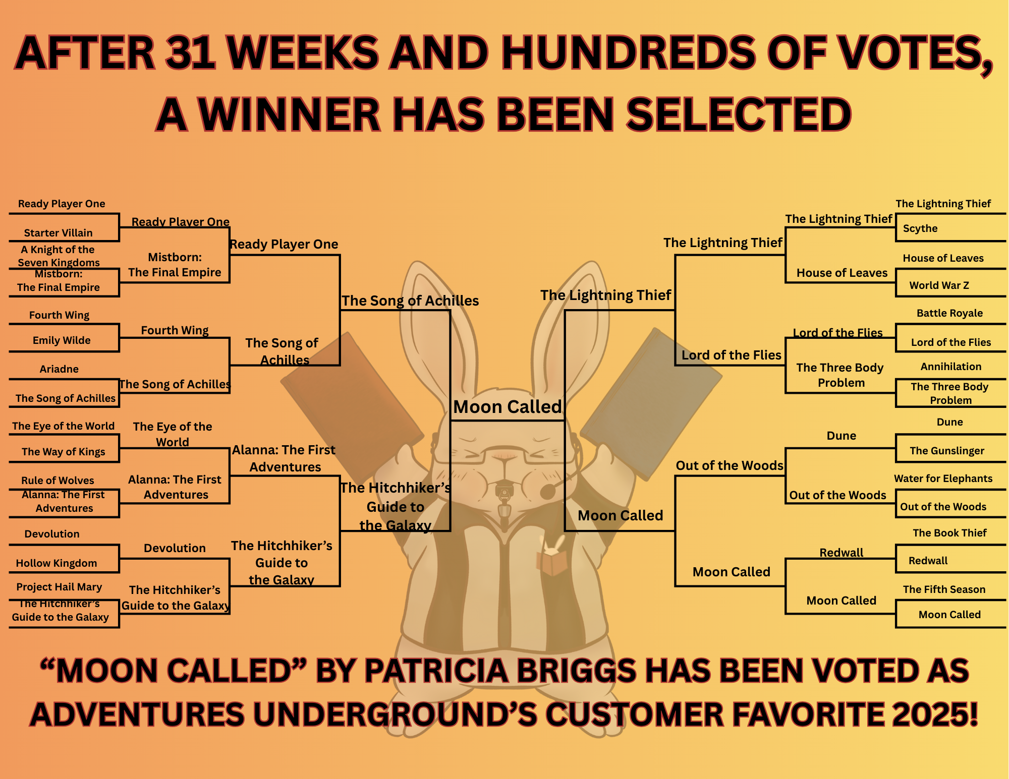 Help us find the Tri-Cities' favorite book! Through the month of January, our customers submitted their nominations for their favorite books, and now it is time for you to vote on which titles you think are best. Each week a new pair of books will be pitted against each other in our Book Battle bracket, and you- our local readers and customers- will have the opportunity to choose a side and vote for the book you think should win. Cast your vote today via our social media pages, or in store.