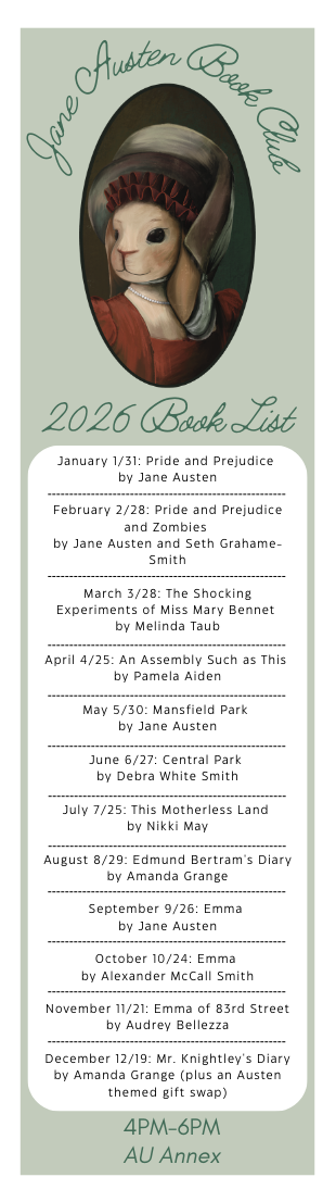 For December, we will be having a game night and tea party to celebrate Jane Austen's 250th birthday! Members have volunteered to bring assorted treats, so feel free to bring something if you feel like it. We will also be doing a Jane Austen themed gift swap. Please put together an Austen themed gift to contribute to the swap, and receive one on exchange (gifting limit set at $35.) Feel free to reach out if you have any questions!